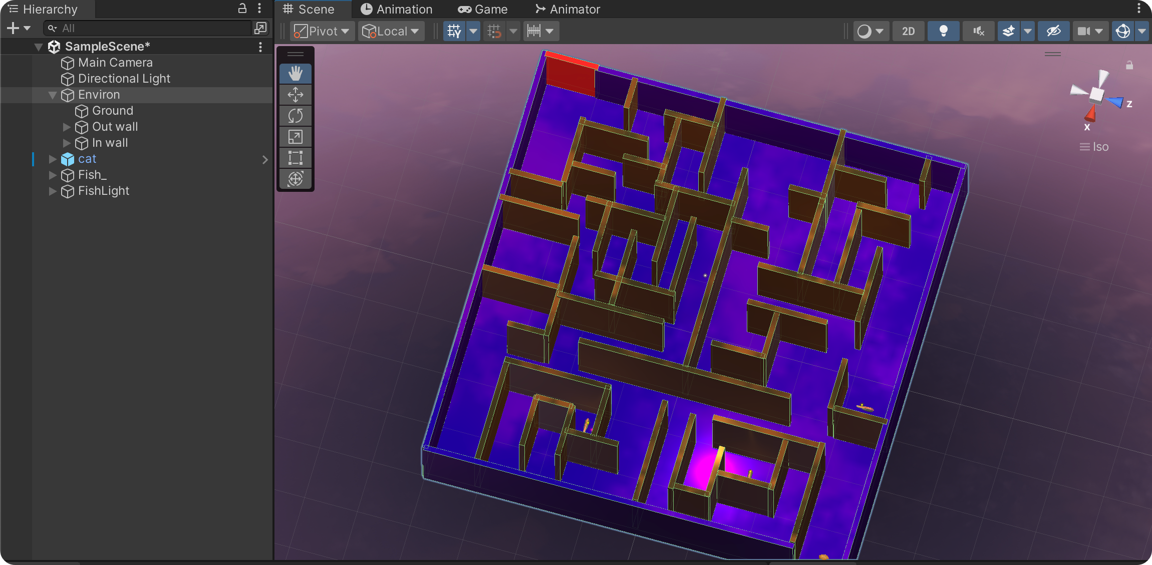 미로 중간에 물고기아이템 5개가 있으며 이 다섯가지 물고기를 다 먹어야 출구 문이 열린다.