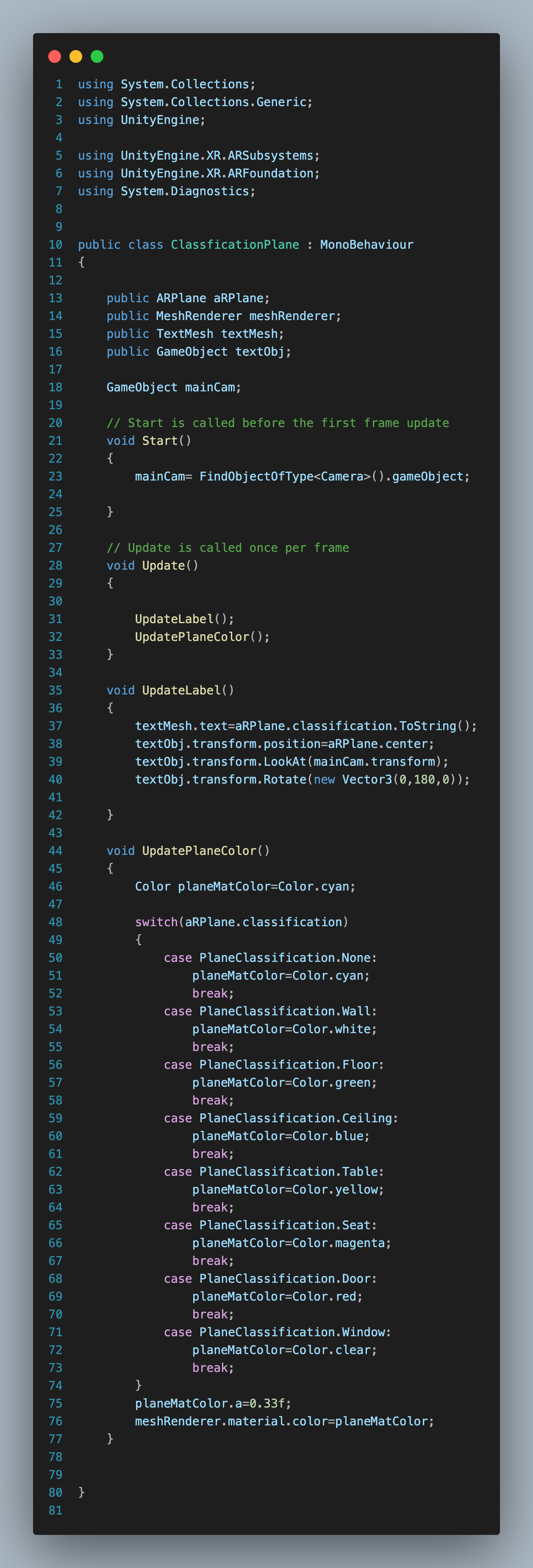 AR default Plane을 이용해 평면을 인식하고, 평면의 종류에 따라 색을 변경한다.