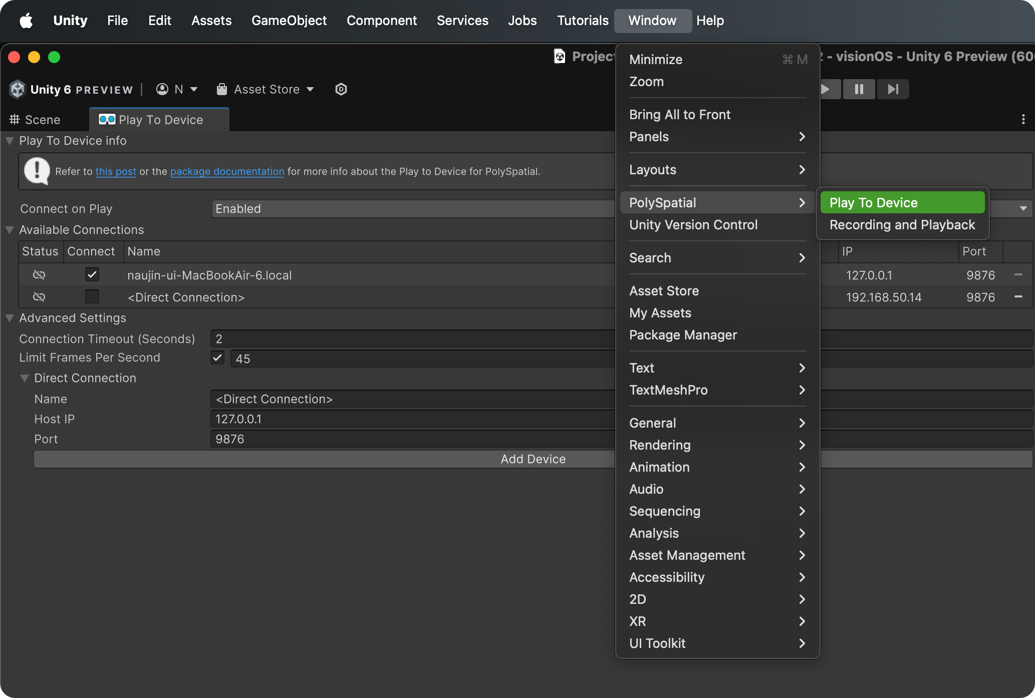 https://docs.unity3d.com/Packages/com.unity.polyspatial.visionos@2.0/manual/PlayToDevice.html