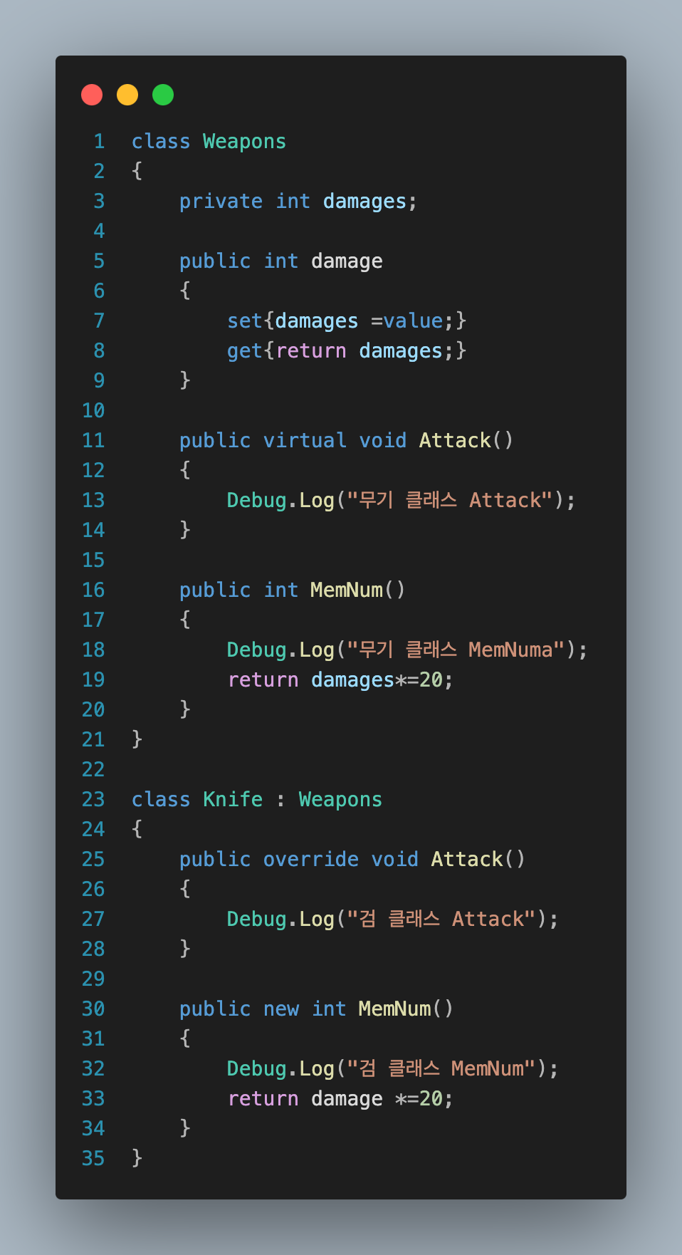 Weapon클래스를 상속받는 Knife클래스에서 override를 사용해 Attack메서드를 재정의 할 수 있다.