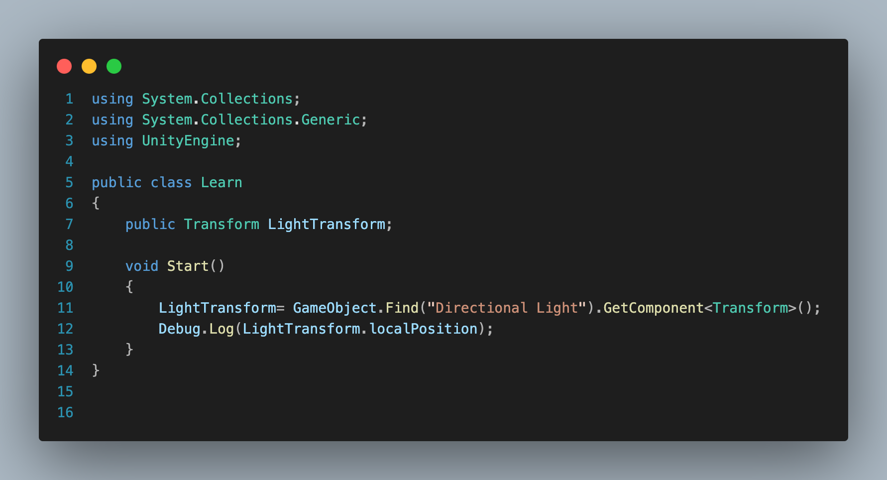 LightTransform필드를 선언하고, Find를 통해 Directional Light라는 게임 오브젝트를 찾아, Transform컴포넌트를 LightTransform에 반환한다. 이후 출력한다.